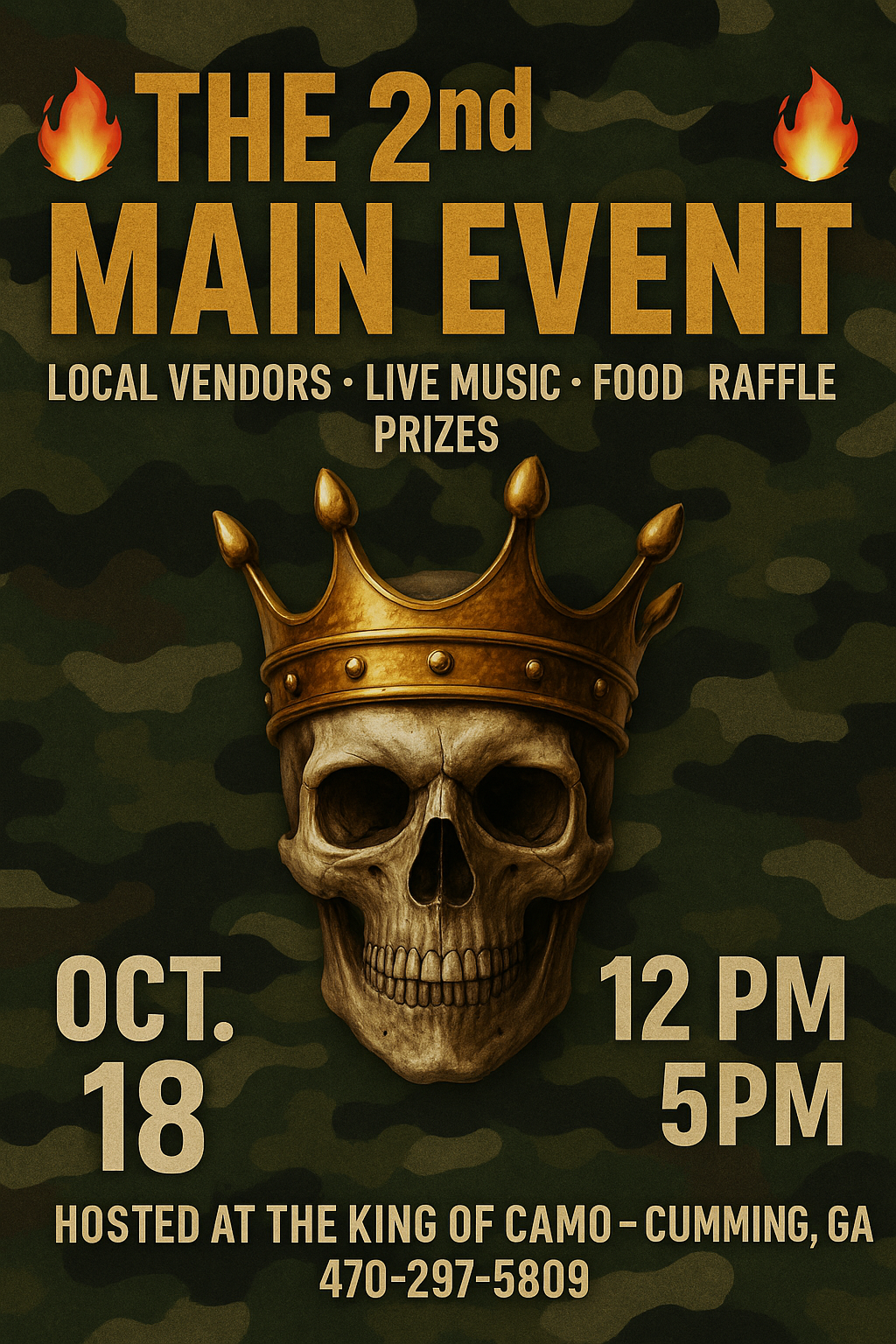 Come enjoy a great fall day with the King of Camo at our 2nd All American Vendor Market. Live Music, Food, and Raffles. Hope to see you there!