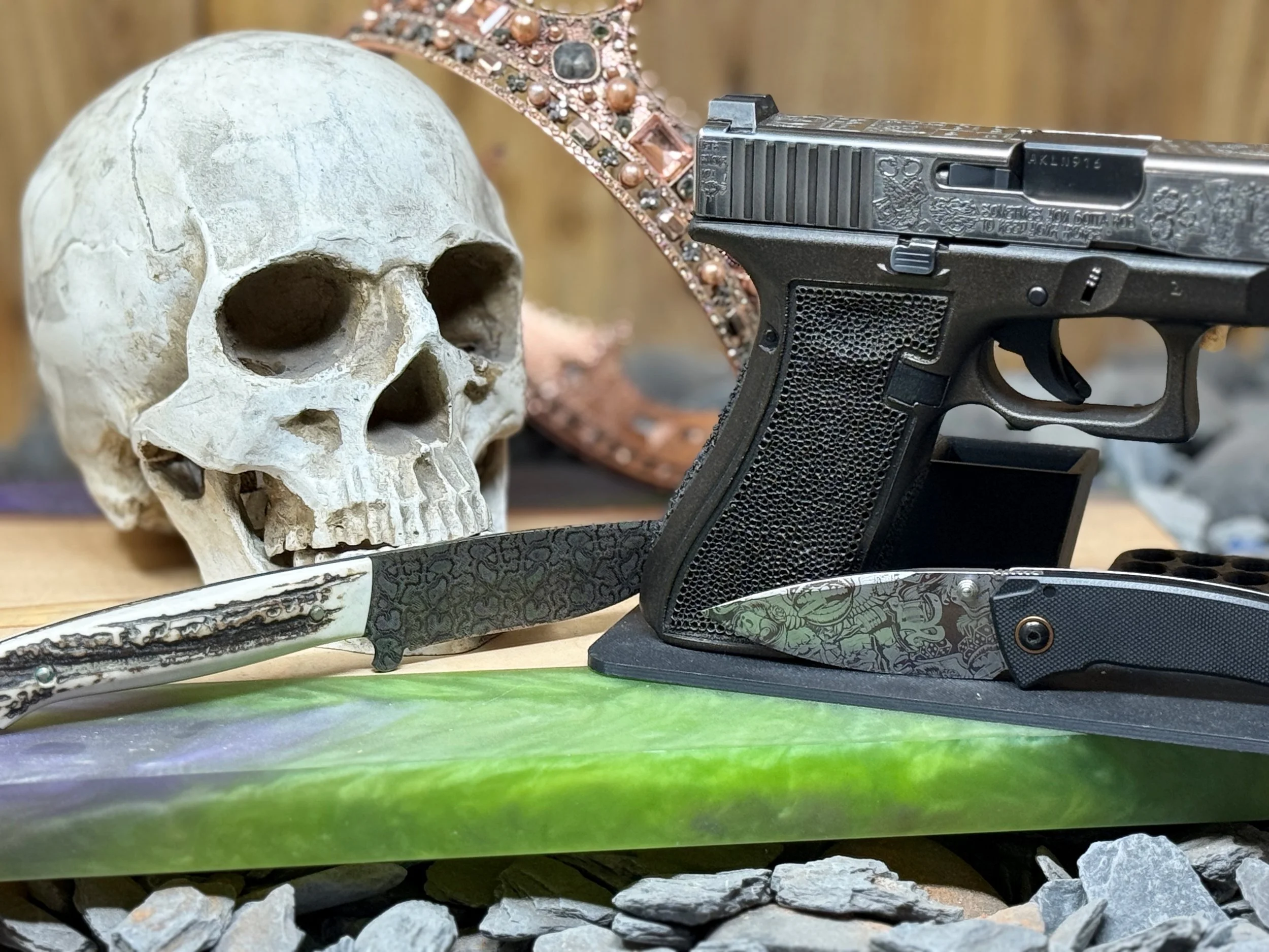 Our metal laser is an 80-watt MOPA Fiber-Optic Laser that has the ability to engrave with extreme detail and precision. This laser not only deep engraves metals but through extensive practice, we also can achieve what is called a “color mark” engraving. This type of engraving is a very light heat treatment of the surface of the metal to reveal a reflective finish! This type of engraving is fantastic for knives and other select projects to reveal an amazing look. We are also happy to share that we now have the ability to engrave wood and leather items as well using an X-Tool Laser system.